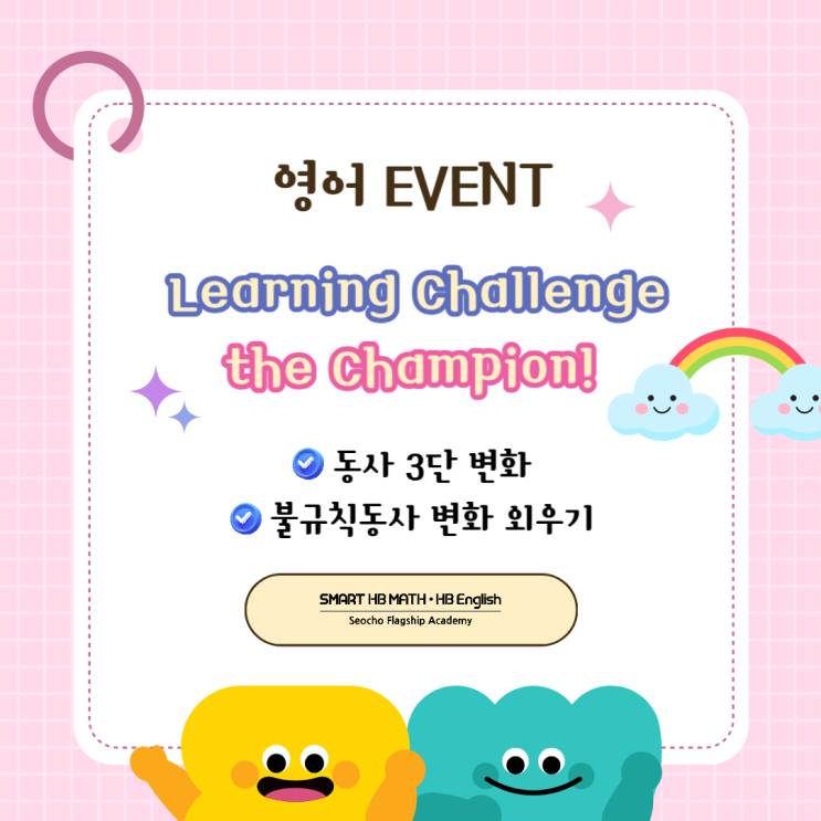 안녕하세요. 우리 아이를 위한 스마트한 선택! 스마트해법 서초플래그십점입니다. 2월 한 달 동안에는 우리 학생들이 새학기 시작에 앞서, 남은 방학을 더욱 더 학습적으로 알차게 보내고, 학습 습관을 꾸준히 유지 시키기 위한 의미에서 영어, 수학 각각 ‘Monthly Learning Challenge’ 대회를 실시 하였습니다. 오늘은 영어 챌린지 과제인 ‘필수 단어’나 기초영문법 필수 암기인 ‘동사 3단 변화’ 중 ‘불규칙 동사 변화’ 외우기 챌린지를 소개하겠습니다. 스마트해법 영어 2월 EVENT Learning Challenge 동사 3단 변화 불규칙동사 변화 외우기! 동사 3단 변화가 왜 중요한가요? 동사 활용은 영어에서 매우 중요한 부분 중 하나인데요, 동....... <img src="https://blogthumb.pstatic.net/MjAyNjAzMDVfOTEg/MDAxNzcyNjc3NTkyMTc2.MgoX3_h5n-UY0GEIbURT9iFO2SfiPePcmPX1QS_armUg.gQHesLy_6bBu-XQR0b0OjXXfI3rI-dp-4fKCTBq2xIIg.PNG/%BC%AD%C3%CA%B5%BF_%BC%AD%C0%CC%C3%CA_%BF%B5%BE%EE%C7%D0%BF%F8-001.png?type=s3" />