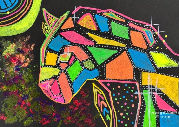 안녕하세요. 지난 달에 올렸던 포스팅 가운데 블랙 캔버스에 발색력이 좋은 아크릴 마커로 완성한 인상적인 작품이 있었는데요, 이 회원의 멋진 결과물에 영감을 받아 많은 학생들이 같은 컨셉으로 근사한 작품들을 쏟아내 이웃님들과 공유합니다.^^ 가성비 좋은 검은 도화지에 위 작품과 비슷한 느낌의 작업을 해 보았어요. 화려한 색을 뽑내는 형광 아크릴 마커를 주로 사용해 그리고 싶은 것을 자유롭게 그리되, 어린 연령의 친구들에게는 주변의 익숙한 동물을 묘사해보도록 미션을 주었어요. 더불어 다양한 패턴을 활용해 화려한 느낌의 그림을 완성하도록 독려했는데, 이렇게나 다양한 동물들을 멋지게 그려준 학생들의 창의력이 대견해요....... <img src="https://blogthumb.pstatic.net/MjAyNjAyMTRfNzAg/MDAxNzcxMDYyNjA0NTYx.68wo9CwrBuJZlADybQKObs7tVRiwE17pbDXfmQy9JqEg.CI1bVcLnoTW-dhnU1Qyc3_7dujOYIUsIDx4YvElH9uMg.JPEG/900%A3%DF1771062025214.jpg?type=s3" />