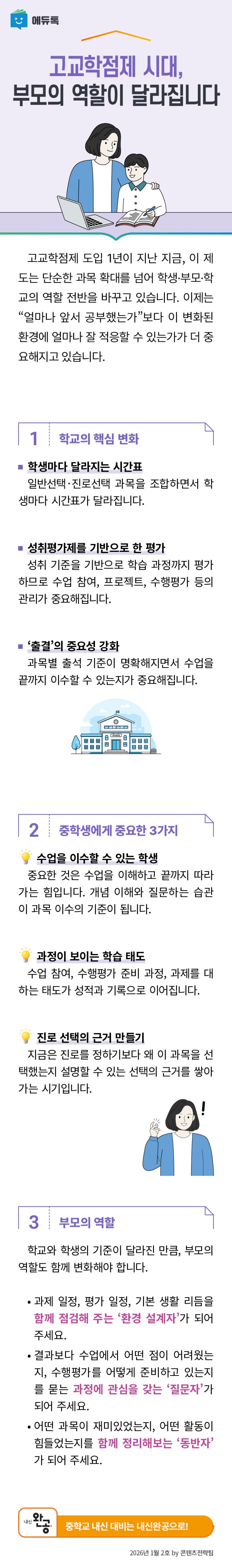 안녕하세요:) 눈높이 서초교육국입니다! 오늘은 고교학점제 도입 이후 달라진 학교 현장과, 그에 따라 달라져야 할 부모의 역할에 대해 이야기해보려고 합니다. 고교학점제가 도입된 지 1년. 이제 학교는 단순히 “정해진 과목을 따라가는 곳”이 아니라, 학생 스스로 선택하고 책임지는 학습의 공간으로 빠르게 바뀌고 있습니다. 이 변화는 학생뿐 아니라 부모의 역할에도 큰 전환을 요구합니다. “얼마나 앞서 공부했는가”보다 변화된 환경에 얼마나 잘 적응하고 있는가가 더 중요해진 지금, 부모는 어떤 역할을 해야 할까요? 고교학점제는 단순한 제도 변화가 아닙니다. 학생, 부모, 학교 모두에게 학습을 바라보는 관점의 변화를 요구합니다....... <img src="https://blogthumb.pstatic.net/MjAyNjAxMzBfMjAw/MDAxNzY5NzQ0ODc0MTYz.XfpNjZnlDXE4Dy3__N7zgNdaIBSn0h8C1GLpji2-DFYg.ckGBR2xgOEfNL82yR-e6QxwJCyMmWnqgMdlBQeGhSFsg.JPEG/2026%B3%E2_1%BF%F92%C8%A3_%BF%A1%B5%E0%C5%E5_%BA%BB%B9%AE_767_full.jpg?type=s3" />