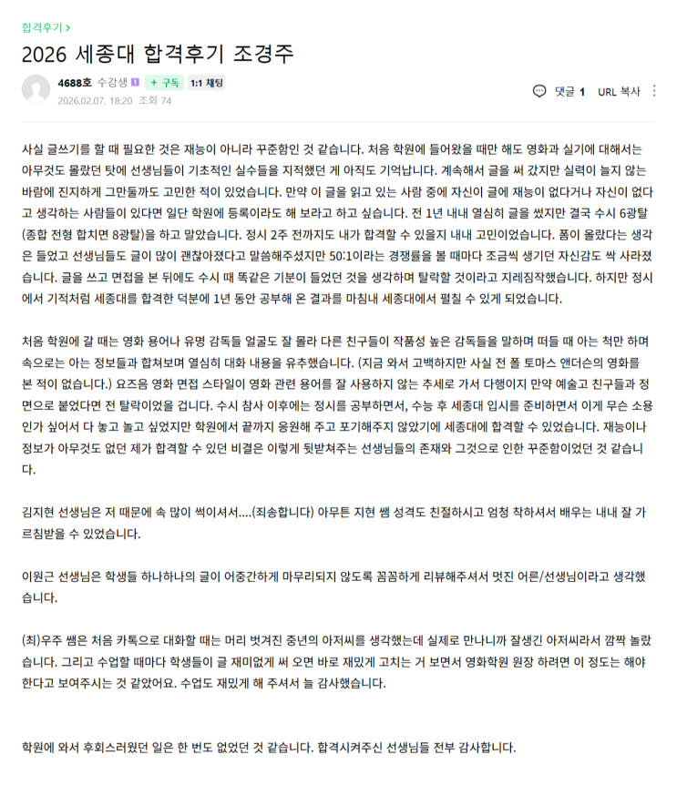 사실 글쓰기를 할 때 필요한 것은 재능이 아니라 꾸준함인 것 같습니다. 처음 학원에 들어왔을 때만 해도 영화과 실기에 대해서는 아무것도 몰랐던 탓에 선생님들이 기초적인 실수들을 지적했던 게 아직도 기억납니다. 계속해서 글을 써 갔지만 실력이 늘지 않는 바람에 진지하게 그만둘까도 고민한 적이 있었습니다. 만약 이 글을 읽고 있는 사람 중에 자신이 글에 재능이 없다거나 자신이 없다고 생각하는 사람들이 있다면 일단 학원에 등록이라도 해 보라고 하고 싶습니다. 전 1년 내내 열심히 글을 썼지만 결국 수시 6광탈(종합 전형 합치면 8광탈)을 하고 말았습니다. 정시 2주 전까지도 내가 합격할 수 있을지 내내 고민이었습니다. 폼이 올....... <img src="https://blogthumb.pstatic.net/MjAyNjAyMTBfMTU0/MDAxNzcwNzI1NDA1NzIz.Y9EK_hCTIFm1D_tfQsbW0z9ezNXYz3gN-xelKEkLDRUg.pmR5z7Jlh0Lg4B3DwUen0-r5U4Szo4auqXQoecR6hgIg.PNG/%BC%BC%C1%BE%B4%EB_%C7%D5%B0%DD_%C1%B6%B0%E6%C1%D6_%C7%D5%B0%DD%C8%C4%B1%E2.png?type=s3" />
