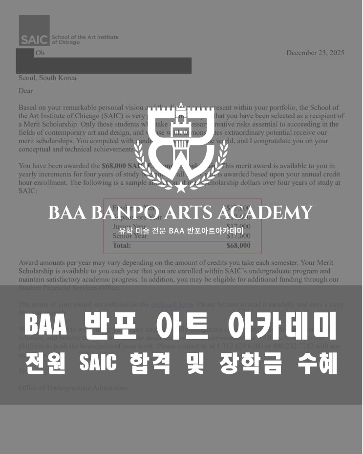 2026 Fall School of the Art Institute of Chicago BFA Studio Program 합격 소식입니다! 지원 학생 전원 합격, 전원 Merit Scholarship을 함께 받았습니다. • SAIC Distinguished Scholarship $96,000 • SAIC Esteemed Scholarship $68,000 학생 각자의 포트폴리오와 방향성에 맞춰 차분하게 준비한 결과입니다. 진심으로 축하합니다~! #SAIC #미국미대 #미대유학 #아트스쿨 #포트폴리오준비 <img src="https://blogthumb.pstatic.net/MjAyNTEyMzFfMzQg/MDAxNzY3MTcxMDIwNDMx.sb_Jl4BPnOIJZUuWUH0tpBPArTQYIvIHmZf-zZ9E9mIg.bqXGownusOnhhLZ9ws8FhX4D4tSZcKpsMYCuZak5L_0g.JPEG/%BA%EA%BE%C6%BE%C6%C7%A5%C1%F6-01.jpg?type=s3" />