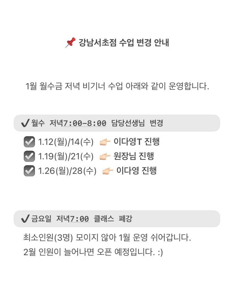 강남서초 1월 월수금 저녁 비기너 수업 변경 안내