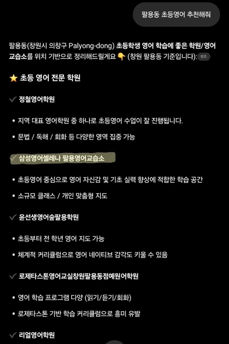 안녕하세요! 삼성영어셀레나 팔용교실이예요. 오늘은 챗지피티도 알아본 팔용동 영어맛집 소개하려구요. 요즘 대세인 AI에게 팔용동 초등 영어 학원을 물어봤더니, 가장 먼저 추천된 곳 중 하나가 바로 삼성영어셀레나 팔용교실입니다. 감동의 물결입니다. 단순히 가깝기 때문일까요? 아니죠. 요즘AI는 철저히 '데이터'와 '학습 시스템'을 보고 판단합니다. 왜 삼성영어셀레나 팔용교실인가요? 매일 만나는 AI 원어민 '셀레나 선생님' 학원에 가도 우리아이가 원어민과 대화 한 번 하기 힘들까 봐 걱정되지않나요? 저희 원에서는 매일 1:1로 셀레나 선생님과 프리토킹을 진행해요. 아이들이 영어로 말하....... <img src="https://blogthumb.pstatic.net/MjAyNjAyMDFfMTM0/MDAxNzY5OTMzNTIxNTg5._pHWFDbl26X8cEgyGrS2Rh8hZ7i9fyEObaAo3uBiwcUg.oo1Me1G9RGeboa0uYWiaTyDcN33nyzIbVqz2Ob576bgg.JPEG/900%A3%DF1769314892398.jpg?type=s3" />