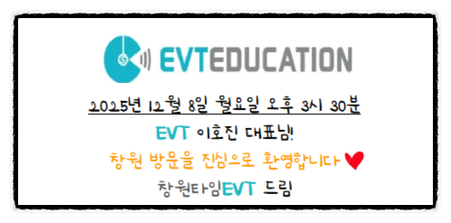 창원 타임 EVT에 정말 특별한 하루가 찾아왔습니다. 이호진 대표님의 방문 소식이 전해진 순간부터 학원은 설렘과 기대감으로 가득 찼습니다. 그리고 드디어 2025년 12월 8일 오후 4시 모두가 손꼽아 기다리던 그 시간이 시작되었습니다. 이날의 분위기는 단순한 ‘방문’이 아니었습니다. 말 그대로 하나의 ‘축제’였습니다. 대표님이 교실에 들어서는 순간 학원의 공기가 달라졌고 학생들의 표정이 환하게 빛났습니다. 평소보다 훨씬 더 적극적으로 참여하는 모습에서 이 시간이 얼마나 특별한지 느낄 수 있었습니다. 가장 인상 깊었던 순간은 바로 1시간 동안 진행된 특별 수업이었습니다. 짧다면 짧고 길다면 긴 시간이었지만 그 안에는 깊....... <img src="https://blogthumb.pstatic.net/MjAyNjAzMjlfMTMw/MDAxNzc0NzkwNTI5NTEz.8Io8_Bsc341vw-tW94Q-_QQHP5cAcSnl1FhPC3ozfAYg.OqVt4Bal2NGEfULQKbsqN-tGY5ougJseWE244yCwNNMg.PNG/KakaoTalk_20260329_221937119.png?type=s3" />