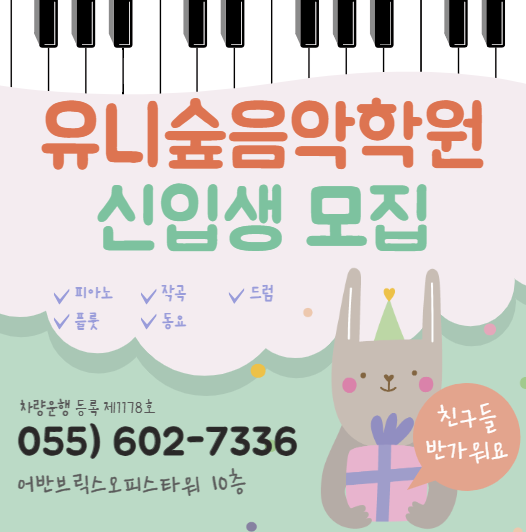 유니숲음악학원 2026년 신입생 모집 음악이 즐거운 아이, 연습이 습관이 되는 아이, 무대에서 성장하는 아이를 키웁니다. 유니숲음악학원은 아이 한 명 한 명의 속도와 성향을 존중하는 맞춤형 레슨으로 기초부터 탄탄하게, 즐겁게 음악을 배워갈 수 있도록 지도합니다. ✨ 유니숲만의 교육 포인트 기초부터 차근차근 배우는 체계적인 커리큘럼 아이 눈높이에 맞춘 개별 맞춤 지도 연주회·이벤트를 통한 성취감과 자신감 향상 음악을 통해 쌓아가는 좋은 추억과 정서적 성장 모집 대상 2026년 기준 유아 · 초등학생 피아노 처음 시작하는 친구도 환영합니다 상담 및 레벨 테스트 수시 상담 가능 (사전 예약제) 아이의....... <img src="https://blogthumb.pstatic.net/MjAyNTEyMzBfNDIg/MDAxNzY3MDI1MzgyNTI5.b3naTqK-78K5m4_n4l5Acmf0jtB2XAxqzLjeMstNGTkg.xaXw24TSDHAQnAMN2yUaRUHj7c4zsVA3YGhUQwzZ8gEg.PNG/1767024854059.png?type=s3" />