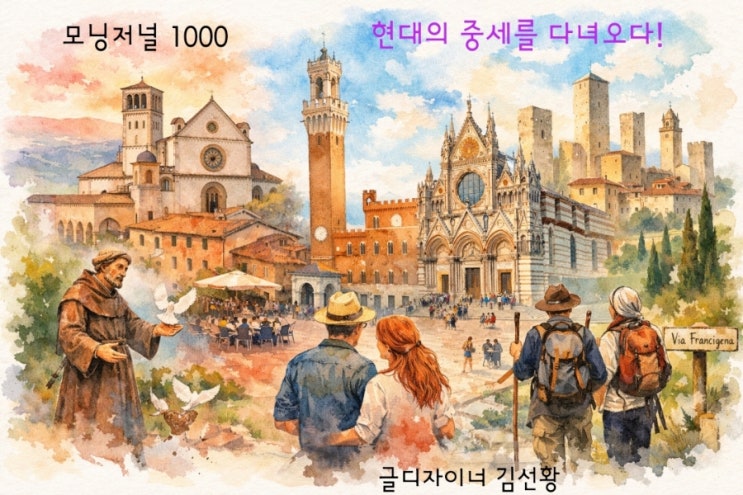 #아시시 #시에나 #오늘의글감 #글디자이너_김선황 골목을 기웃거리며 천 년 전의 일상을 엿보았습니다. * 2026년 3월 1일 일요일 모닝저널 1000 이탈리아 4일차 아시시 · 시에나 · 산 지미니아노 오늘은 중세의 시간 속으로 깊이 들어가는 날이었습니다. 먼저 도착한 아시시는 ‘핑크 도시’라 불릴 만큼 따뜻한 빛을 띠고 있었습니다. 돌벽과 지붕이 분홍빛으로 물들어 마을 전체가 노을을 머금은 듯했습니다. 평화의 도시라는 이름답게 공기는 차분했습니다. 그러나 올해는 프란체스코 희년이 선포되어 성당 내부로는 들어갈 수 없었습니다. 대신 광장과 골목을 천천히 걸었습니다. 아시시의 프란체스코는 부유한 상인....... <img src="https://blogthumb.pstatic.net/MjAyNjAzMDFfMjk0/MDAxNzcyMzE3MzQzMjcz.cJ5VyDdlMDFGjaJiKfDAegZj28J-IDaQIG1krOVyeYsg.yYf_JAXCeS60KQT2RImnerDTlL08DLoDpXd-qB7YkLIg.JPEG/900%A3%DF20260228213323.jpg?type=s3" />