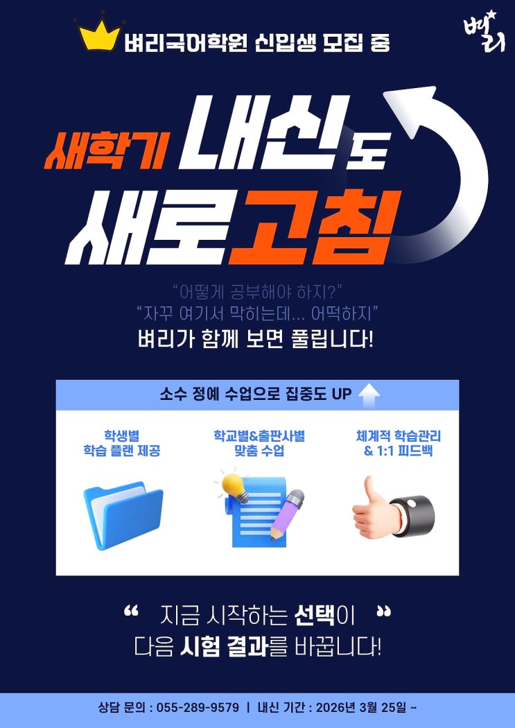 안녕하세요! 부산 경남 창원 마산 진해 거제 수능·내신 국어의 길잡이 벼리국어학원입니다. 어느덧 겨울방학이 끝나고, 3월 개학철을 맞아 학생들이 설레는 신학기를 보내고 있을텐데요. 약 1달 후면, 4월 20일부터 5월 초까지 학교마다 다소 차이는 있겠으나 어김없이 중간고사 기간이 돌아왔습니다. 신학기인 만큼, 원하는 결과를 얻기 위해서 철저히 준비해야겠지요? 우리 벼리국어학원에서는 3월 말부터 내신집중기간에 돌입합니다. 국어의 전통강자, 벼리국어학원의 내신 시스템에 대하여 간략하게 포스팅하도록 하겠습니다. 소수 정예, 개인별 맞춤 내신 전략 : 벼리국어학원 내신 시스템 학교별 / 출판사별 내신 대비 벼리국어학원은, 다....... <img src="https://blogthumb.pstatic.net/MjAyNjAzMTJfMTI2/MDAxNzczMzE5ODI1MTM1.M_06KtpVpacPZ_XAb-AE6FtU520mE0FhbmsWTH1BOjEg.L_ZkBb1G9bp7kingdMydwdgaHfk9h5_i0L1ZOoN3W0Ug.JPEG/%C1%A6%B8%F1%C0%BB_%C0%D4%B7%C2%C7%D8%C1%D6%BC%BC%BF%E4._%286%29.jpg?type=s3" />