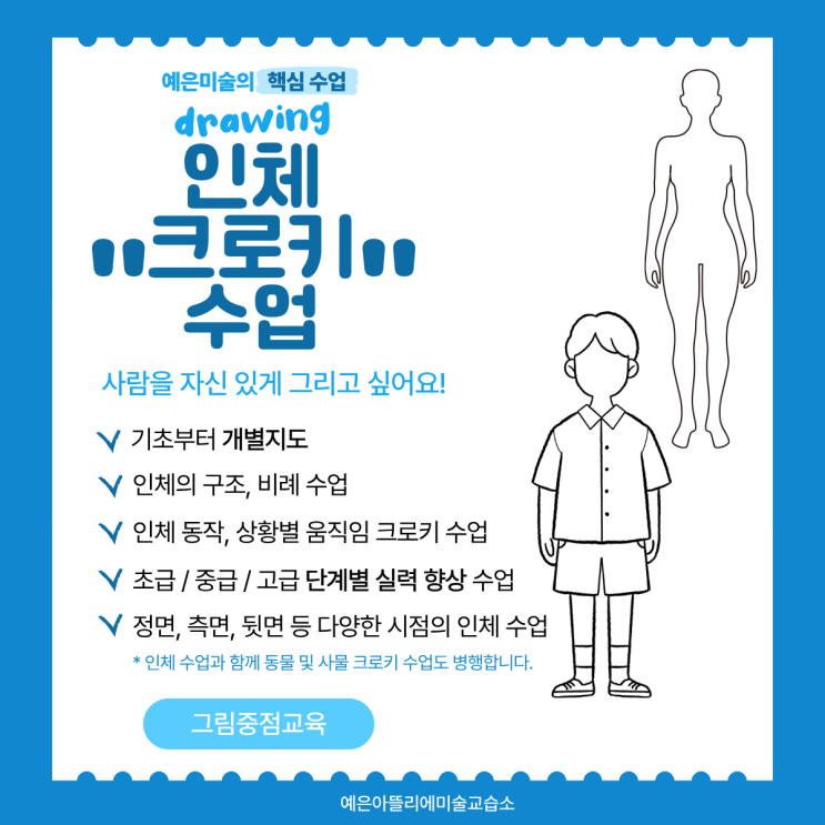 트렌드는 끊임없이 변화하지만, 기초는 변하지 않습니다. 핵심수업 안내 ▪︎인체 크로키 수업 ▪︎수채화 수업 ▪︎소묘 수업 = 기초탄탄, 그림 중점교육 저희 예은미술은 위의 세가지 수업을 중점으로 기초를 튼튼하게 다지며 다양한 주제와 기법적 미술 활동을 펼칩니다! 트렌드는 끊임없이 변화하지만, 기초는 변하지 않습니다. 시간이 지나도 후회없는 미술 교육으로 보답하겠습니다. 수업문의: 055-263-5640 <img src="https://blogthumb.pstatic.net/MjAyNjAyMTlfMjU3/MDAxNzcxNTA3MzQzMDky.a48ShQyRAl8F0s45lckJ8fdF8dWwt2VR254aqXk9QB8g.SWKO2DhzfU9Lfq-Be3BM-zEeLeMI-H9bDY8XXbVKkmIg.PNG/1771468764155.png?type=s3" />