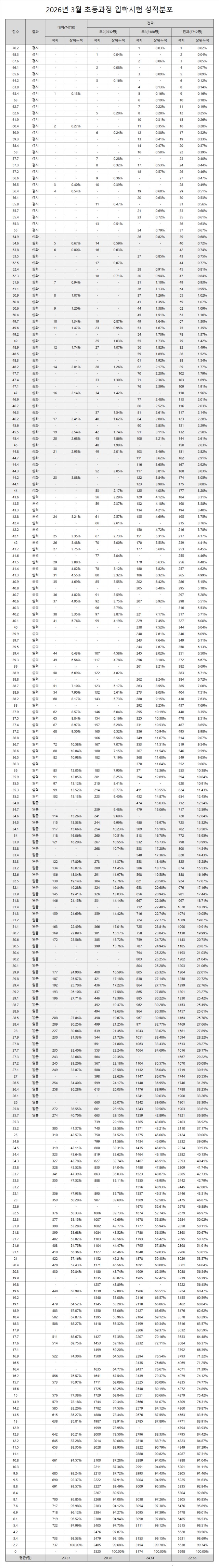 2026년 3월 초등 입학시험 성적분포 - 전국