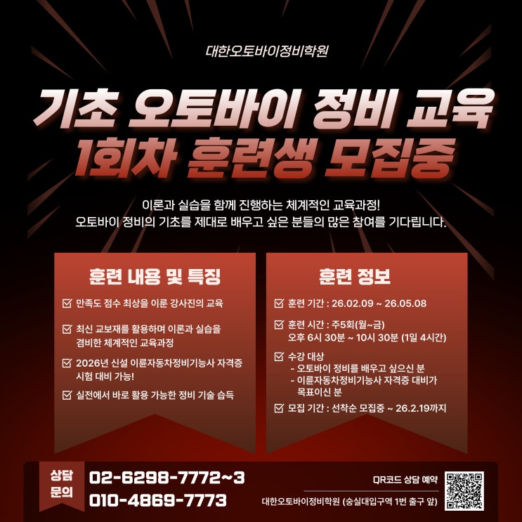 ☞ 고용24 직업훈련 검색창에 [대한오토바이정비학원]을 검색해주세요☜ 정부지원 내일배움카드 오토바이 정비 교육 (1회차) 선착순 모집중! 오토바이 정비를 처음부터 제대로 배우고 싶다면 대한오토바이정비학원의 "기초 오토바이 정비교육"으로 시작해 보세요. 2026년 2월 9일에 개강하는 1회차 기초 오토바이 정비교육은 처음 배우는 분도 이해할 수 있도록 이론과 실습을 함께 진행합니다. 교육과정 안내 ※ 훈련 기간 : 2026.02.09 ~ 2026.05.08 (240시간, 3개월 과정) ※ 훈련 시간 : 주5회 (월~금) 오후 6시 30분 ~ 10시 30분 (1일 4시간) 이런 분께 추천합니다 ★ 오토바이의 구조와 정비를 기초부터 배우고 싶으신....... <img src="https://blogthumb.pstatic.net/MjAyNjAxMDZfMTgx/MDAxNzY3NjgwMjIwNzUz.j_4YDWQIMVSWtUpEJGqsPnJMD6ViZdvzjIsCbjFldB4g.V1U4J3zisA13Zz0nnITzYD3YoOgAHYh7WG5SXV07NCgg.JPEG/1%C8%B8%C2%F7_%B8%F0%C1%FD.jpg?type=s3" />