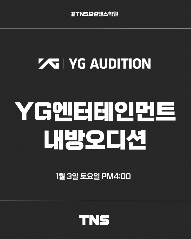 안녕하세요! 창원 중앙동에 위치한 창원 댄스학원 / 오디션 전문학원 TNS보컬댄스학원 입니다~!! 2026년 새해 시작 잘 하고 계신가요~!! 다들 2026년에는 이루고 싶은 일 모두 이루시길 바랍니다 ㅎㅎ 오늘 포스팅은! 바로 1월 2주차 TNS보컬댄스학원 내방오디션 소식!! 2026년에도 열심히 내방오디션을 진행하는데요~!! 어떤 소속사일지 바로 알아보러가시죠!! YG엔터테인먼트 내방오디션 #YG엔터테인먼트 1월 3일 토요일 오후 4시 TNS보컬댄스학원에서 YG엔터테인먼트 #내방오디션 이 진행되었습니다!! YG엔터테인먼트에는 정말 유명한 아티스트들이 많은데요~!! #블랙핑크 #베이비몬스터 #트레저 #위너 #은지원 정말 유명한 곡들도 많은 아티....... <img src="https://blogthumb.pstatic.net/MjAyNjAxMDdfMTcz/MDAxNzY3NzczODQzMDk3.P_u5ghZz9YedkUqXa7XofNK5stryMl0QXt2kKL9EYQUg.trbUO92evM2uzj6m0JXX6UWXTitA-7P22Z30bhdaFW8g.PNG/%C1%A6%B8%F1%C0%BB_%C0%D4%B7%C2%C7%D8%C1%D6%BC%BC%BF%E4._-_2026-01-02T175342.848.png?type=s3" />