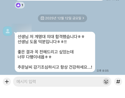 안녕하세요 고산서원 원장 고은호입니다. 입시 결과가 하나둘씩 나고 있네요. 올해는 작년보다 그래도 기분이 홀가분하니 좋네요. 작년은 입결만 놓고 보면 의대도 셋 약대도 하나 서울대 경영에 성균관대 공학계열장학생, 부산대 자연과학대 전체수석 좋은 학교간 학생들이 많았지만, 그래도 제가 학생들에게 너무 미안한 마음이 많이 들었던 한해입니다.. 서울대 의대 지원한 학생의 경우 최저때문에 불합격 했고, 울산대 의대 비롯 다수 의대에 서류 합격해 놓은 상태에서 최저에서 문제가 생기는 재수를 결정했습니다. 그리고 우리 학원 도우미 샘으로 열심히 일해주고 있는 약대생도 사실은 서류에서 5곳(모두 최저 3합4)의 의대를 모두 합....... <img src="https://blogthumb.pstatic.net/MjAyNTEyMTRfMTcw/MDAxNzY1Njc5NjI2MjM0.lc_oWO-XGLMRnawTJRLP_GtFKCiRYgM6NGy5LIjbK78g.WNisHC4GNkVGHUOfp49ON2GI37sr5D1mPiu4WInfYxYg.PNG/KakaoTalk_20251214_113045859_07.png?type=s3" />