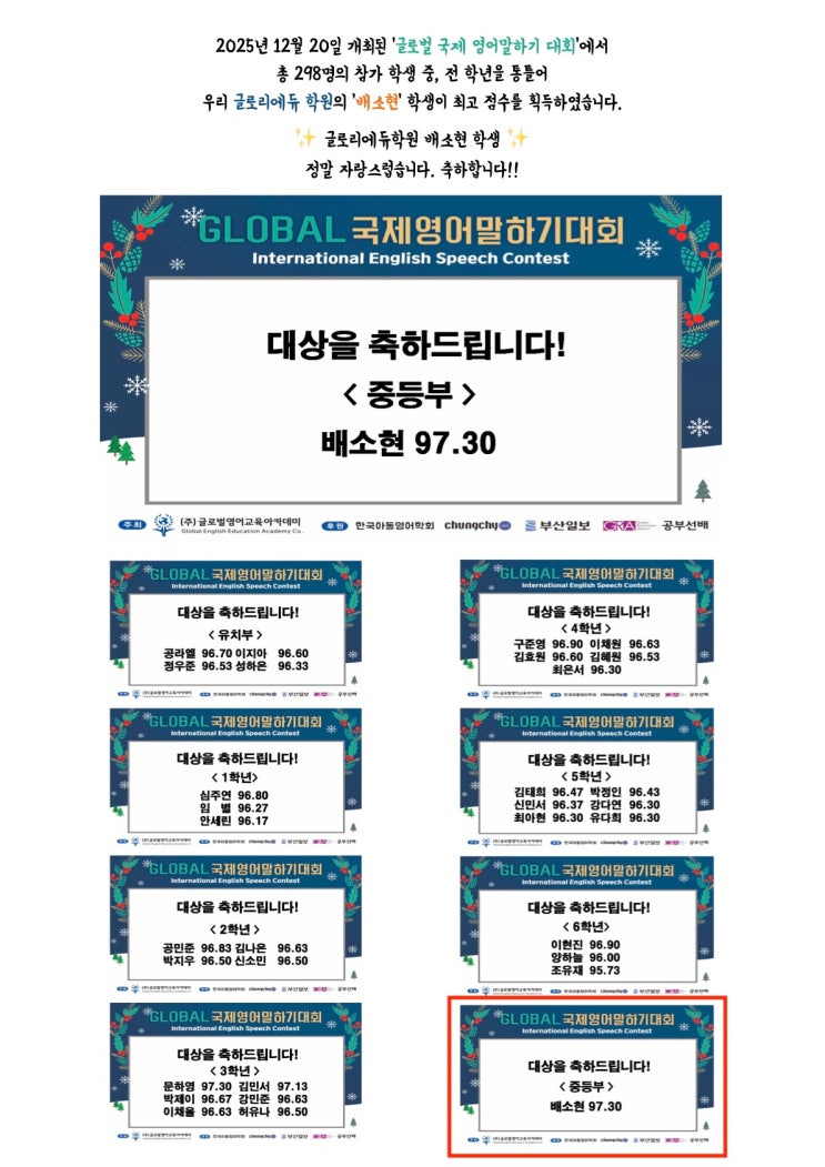 이번 글로벌 국제영어말하기 대회에 참가했던 '5학년 박수현 (동상)', '6학년 최연재 (동상)', '중1 배소현 (대상)', ' 중3 김민준 (금상)' 네 학생 '전원 수상'을 했습니다! 수상한 우리 학생들은 대회 '상장'과 '트로피'뿐 아니라 4주간 필리핀 영어 캠프에 참가할 수 있는 혜택과 지원금 20-40만원 상당의 혜택을 받게 되었습니다. 준비 기간이 짧았는데도 불구하고 각자 대본을 짜고, 외우고, 연기까지, 모두가 아주 열심히 준비를 했기 때문에 성취할 수 있었던 성과물이라고 볼 수 있겠네요 특히 우리 소현 학생은 전 참가자를 통틀어 최고점....... <img src="https://blogthumb.pstatic.net/MjAyNTEyMjNfNTYg/MDAxNzY2NDkwODIwMjUx.zJY_SQzgbjf8W-QAfnsAcEowTeLzKHma9yhzxQVJH6sg.MJHLk19Mw4TYZiov0pHkNK9GLexLW9k4BNVrmuv_JaMg.JPEG/%26lrm%3B2.%26lrm%3B1.jpeg?type=s3" />