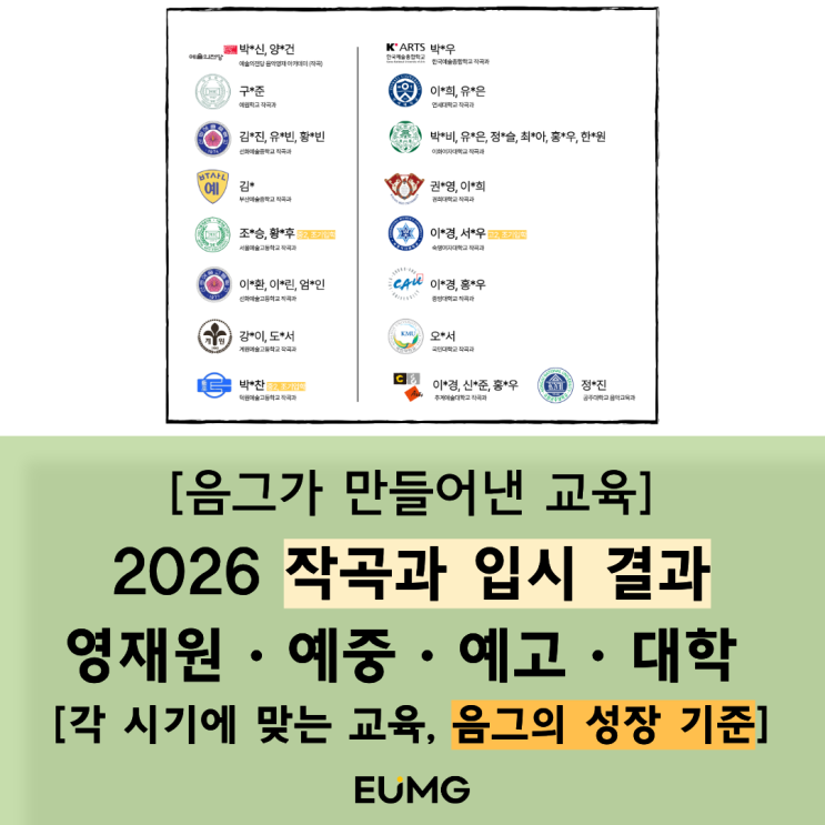 2026 음그 작곡과 입시 결과 / 각 시기에 맞는 교육, 음그의 성장 기준 / 영재원 작곡과 / 예중 작곡과 / 예고 작곡과 / 연세대 작곡과 / 이화여대 작곡과 / 작곡학원