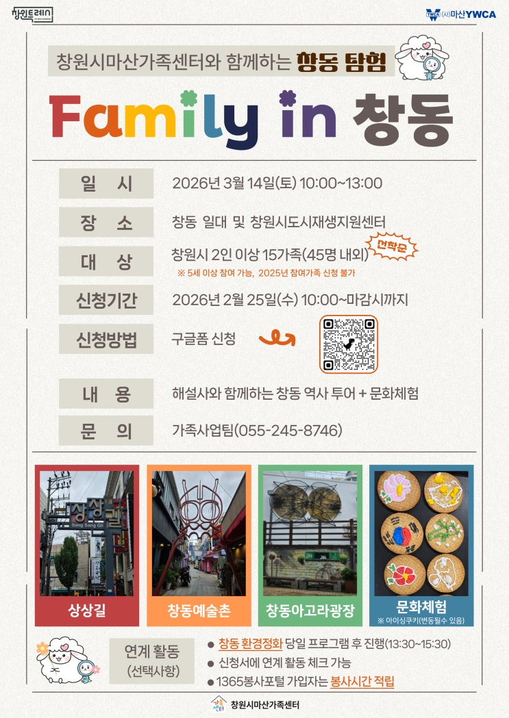 [Family in 창동] 참여가족을 모집합니다. 마산의 역사와 문화, 예술을 간직하고 있는 [창동 탐험 프로그램] 에 참여하실 가족을 모집합니다. 본 프로그램은 해설사와 함께하는 창동 역사 탐방과 문화체험으로 진행됩니다. 가족 여러분의 많은 관심과 참여를 바랍니다. 자세한 사항은 홍보지를 참고하십시오. 감사합니다. 1. 일시: 2026년 3월 14일(토) 10:00~13:00 2. 장소: 창동 일대 및 창원시도시재생지원센터 3. 대상: 창원시 2인 이상 15가족(45명 내외) ※ 5세 이상 참여 가능, 2025년 참여가족 신청 불가 4. 신청기간: 2026년 2월 25일(수) 10:00~마감시까지(선착순) 5. 신청방법: 구글 폼 (https://forms.gle/LWN91jVo26q4GYCd7) 6. 내....... <img src="https://blogthumb.pstatic.net/MjAyNjAyMjdfMTQz/MDAxNzcyMTIwNDQxNDgx.IPDtK3h_u8FLjD1mJir1-6XqjEpP3PiDvOSq2vZ5t_Mg.BUZYCRT6dd7a7C-9s0CevJLUuv6h4XDXnq_v1l2EliUg.JPEG/KakaoTalk_20260226_122612147.jpg?type=s3" />