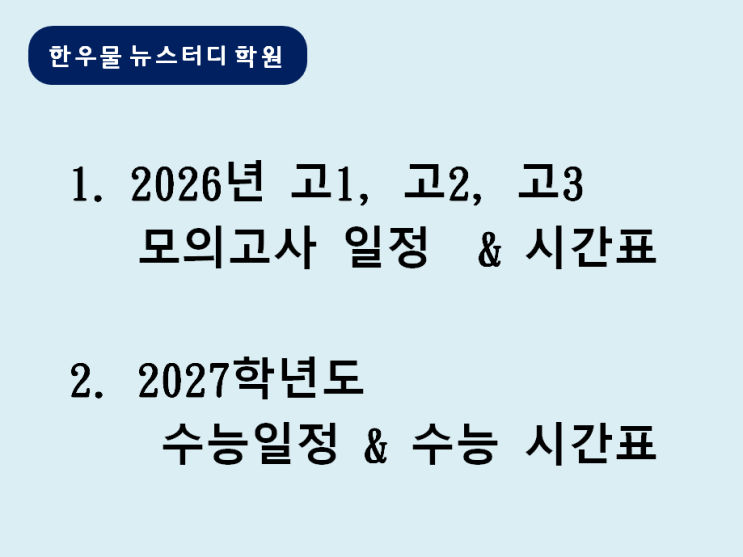 안녕하세요 마산수학과학학원 한우물 뉴스터디 학원입니다. 2026년도 전국연합학력평가 즉, 모의고사와 2027 수능 일정, 시간표 안내드립니다. 2026 고1, 고2 모의고사 일정 고1, 고2 친구들은 1년에 총 4번의 모의고사가 예정되어 있습니다. ▶고1 친구들 고1 친구들에게 모의고사는 처음 경험하는 시험입니다. 그래서 긴장되는 게 너무나 당연해요. 내신과 달리, 100분 동안 30문항을 풀어야 하고 문제 유형도 낯설게 느껴질 수 있습니다. 한우물 뉴스터디 학원에서는 친구들이 모의고사를 부담스럽게 느끼지 않도록 ☞ 기출문제 풀이로 충분히 유형을 익힌 뒤 ☞ 실제 모의고사를 치를 수 있도록 차근차근 대비하고 있습니다. ▶고 2 친구들 고....... <img src="https://blogthumb.pstatic.net/MjAyNjAxMjBfMjE0/MDAxNzY4ODM5ODEyODE3.qAU9C5Vm_VozcI9ztkbZ4GpU3RKBZpqZzwaetISPdIcg.pI4DltIfmmhyr0wMIgtO9w-nQq1roAXyhxjV5MA_gn4g.PNG/image.png?type=s3" />