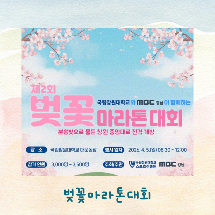 국립창원대학교와 MBC경남이 함께하는 제2회 벚꽃마라톤대회를 소개합니다 안녕하세요 월영동아동미술 재미있는 놀작입니다^^ 따뜻한 봄바람과 함께 벚꽃이 피는 계절이 다가오고 있습니다 놀작에서도 봄을 맞이하는 수업들로 준비를 하고 있어요 그래서 오늘은 놀작에 전해지는 봄소식을 타고 우리 지역 반가운 봄소식 하나 소개하려고 합니다~~ 바로 국립창원대학교와 MBC경남이 함께하는 제2회 벚꽃마라톤대회입니다 제2회 벚꽃마라톤대회 이번 대회는 경남 창원의 아름다운 캠퍼스 벚꽃길을 배경으로 진행됩니다. 캠퍼스 곳곳에 흐드러지게 핀 벚꽃 아래를 달리며 러닝의 즐거움과 봄의 설렘을 동시에 느길 수 있는 특별한 행사입니다. 작년....... <img src="https://blogthumb.pstatic.net/MjAyNjAzMDZfMTYz/MDAxNzcyNzU5OTkxNTE1.iHQiVPbe2Oz9dc0rDwfyp2T2cORQcg2tl39LrNJCvo0g.HPQV5x_qI5BX7Gjc8cJ270PuxJgnv5vzm-yTCBO5Bqsg.PNG/%B0%A8%BB%E7%C7%D5%B4%CF%B4%D9_%C0%CE%BD%BA%C5%B8%B1%D7%B7%A5_%B8%DE%BD%C3%C1%F6_%C4%AB%B5%E5.png?type=s3" />