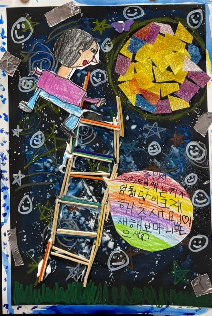 2026년 새해를 맞아 아이들과 함께 ‘달에게 소원을 빌어요’ 미술 활동을 진행했습니다. 이번 수업은 새해라는 의미 있는 시기를 맞아 아이들이 희망·기대·목표와 같은 긍정적인 감정을 떠올리며 상상력을 바탕으로 하나의 이야기를 만들어보는 커리큘럼으로 구성되었습니다. ✨ 입체적으로 표현한 달과 밤하늘 반짝이는 홀로그램 종이 위에 아크릴 펜으로 달의 분화구를 하나하나 그려 넣어 입체감 있는 달을 완성했습니다. 재료의 반짝임과 질감을 직접 관찰하며 아이들은 재료의 특성에 따른 표현 방법을 자연스럽게 이해할 수 있었고, 같은 재료를 사용해도 아이들마다 전혀 다른 달이 만들어지며 개성과 창의성이 돋보이는 작품들이 완성되....... <img src="https://blogthumb.pstatic.net/MjAyNjAxMDdfMTU1/MDAxNzY3Nzc3OTk5NjMy.Y9j7nX_7zahBFBTr7lLo1ReOaoiR10Fd0WTv9Tx-AfYg.i3ZmNeEIyYMEd0hA3gtJz1meZ5Kkqc0iT0t9rxYE6w8g.JPEG/IMG%A3%DF5778.jpg?type=s3" />