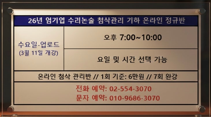안녕하세요^^ 엄기엽수학논술전문학원 엄기엽 원장입니다. 수리논술로 대학에 합격하기 위해서 일부 대학들은 기하를 반드시 준비하셔야 합니다. 따라서 수리논술 전형으로 지원을 희망하는 대학에 맞춰 기하 개념과 수리논술 적용 연습이 필요한 학생들을 대상으로 수리논술 기하 첨삭관리 온라인 정규반 개념과 적용 수업을 26년 3월 11일(수)에 개강합니다^^ 이 수업은 매주 온라인으로 진행되는 수리논술 기하 7주 수업입니다. 매주 수요일 7시 업로드하며 2~3시간 정도 수업합니다. 수업 영상을 통해 다른 요일 및 시간에도 자유롭게 수강이 가능합니다. 수강 대상은 다음과 같습니다. 1. 미적분이나 확통 선택자로 수리논술 지원 시 기하 개....... <img src="https://blogthumb.pstatic.net/MjAyNjAyMDZfMTUg/MDAxNzcwMzA0Njc5OTA4.QZjn78ELNPZs98G_9ncXb3KfnzwIXzO8SsnSkFjSQkwg.VP5MxZxXU1Xir6KuwL618CimfMMS4RqLzQcfYGQtE64g.JPEG/KakaoTalk_20260206_000946910_02.jpg?type=s3" />