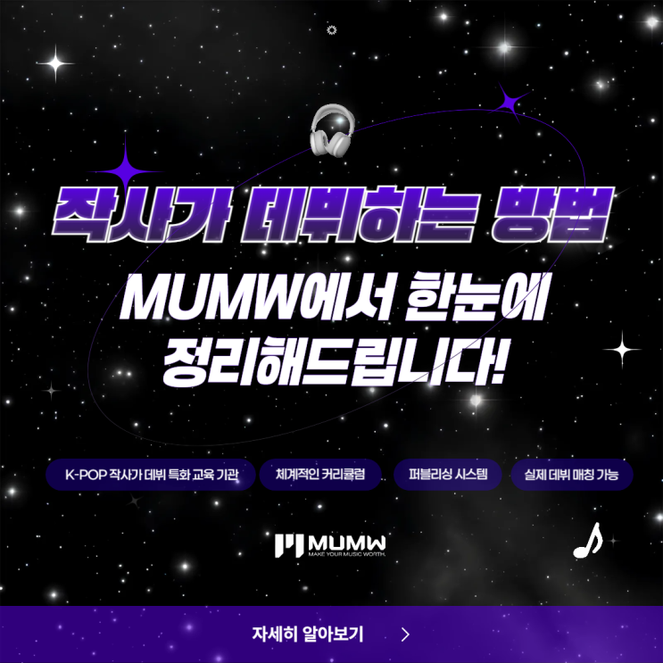안녕하세요. 200여 명의 신인 작가를 배출한, K-POP 작사가 데뷔에 특화된 교육 기관 MUMW(메이큐마인웍스)입니다. 작사가가 되려면 어떻게 시작해야 할까요? 막연하게 작사를 좋아하는 마음만으로는 데뷔까지 이어지기 어렵습니다. 체계적인 커리큘럼과 실제 현장과 연결된 시스템이 필요하기 때문입니다. 국내 K-POP 작사가 데뷔 특화 교육 기관! 실전형 데뷔 커리큘럼을 갖춘 MUMW 프로세스를 소개합니다! HYBE·SM·JYP 작사가의 실전 데뷔 클래스 위 수업은 단순 취미 과정이 아닌, 실제 데뷔를 목표로 설계된 로드맵입니다. MUMW 프로세스 작사가로 성장하는 단계별 로드맵 : ① 기초반 (6개월 수료) ② 실전반 (3개월 수료) ③ 데뷔반....... <img src="https://blogthumb.pstatic.net/MjAyNjAzMDNfMjUw/MDAxNzcyNTAxNDQ0Nzk5.E3n8gXNeuPc6a28H39Ne0osfMPUG5gbE8uLQjh1gUQEg.Kj2JaRxkUaZ6e7pDq85lYAZYcRiyPE1joxz8n32ocmQg.PNG/%B3%ED%C7%F6%B5%BF_%C0%DB%BB%E7%C7%D0%BF%F8-001_%282%29.png?type=s3" />