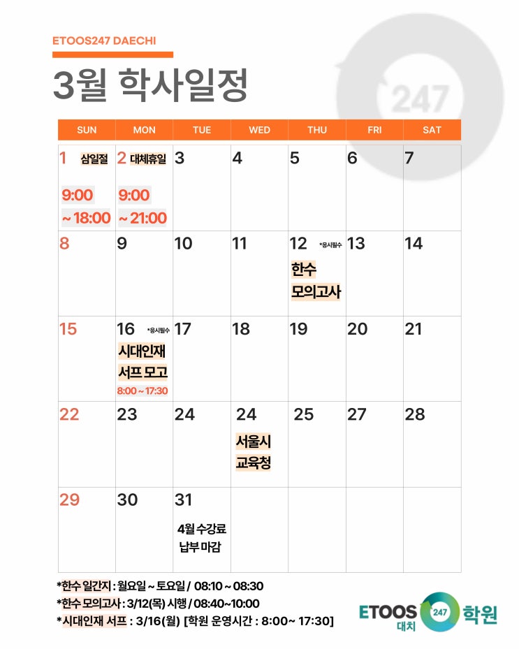 [이투스247대치점] 3월 학사일정 안내