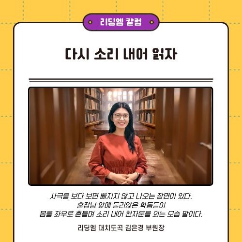 안녕하세요, 초등학생 중학생 독서논술 학원 책읽기와 글쓰기 리딩엠입니다. 아이에게 책을 읽게 하면 이런 고민이 들 때가 있습니다. 학부모님들의 고민 Q. 책을 읽었는데 내용 이해가 안 되는 것 같아요. Q. 국어 독해력이 약한 것 같아요. Q. 읽기는 하는데 발음이 어색해요. 오늘 교육 칼럼은 이와 같은 고민을 가진 학부모님들을 위해 '소리 내어 읽기'가 아이들의 독해력과 국어 실력에 어떻게 도움을 주는지 이야기합니다. 다시 소리 내어 읽자 하늘 천, 땅 지, 검을 현, 누를 황. ……. 사극을 보다 보면 빠지지 않고 나오는 장면이 있다. 훈장님 앞에 둘러앉은 학동들이 몸을 좌우로 흔들며 소리 내어 천자문을 외는 모습 말....... <img src="https://blogthumb.pstatic.net/MjAyNjAzMTBfMjcw/MDAxNzczMTI2Mzg3ODk5.g55GZunNynNG1AXSFCU0WB7LPTapSZSn2SRKY_Ngfz0g.k3R2f06ZBBkRPj6qk5WMtv8CAgNm2o0jrQ_dIRQuL-Mg.JPEG/1.jpg?type=s3" />