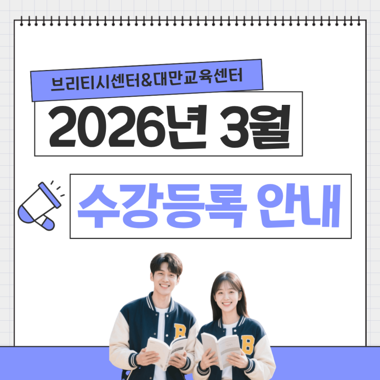 안녕하세요. 브리티시센터 & 대만교육센터입니다. 새로운 시작의 계절인 3월 개강 시즌을 맞아 영국 유학 및 대만 유학 준비 과정의 3월 수강 등록 안내를 드립니다. 각 과정은 정해진 정원에 따라 운영되며 등록 상황에 따라 조기 마감될 수 있으니 참고 부탁드립니다. 개강 일정 및 과정 2026년 3월 과정은 2026년 2월 19일(목)부터 과정별로 순차 개강합니다. 1차 3월 3일 화요일 개강 2차 3월 10일 화요일 개강하며, 월수금반은 1차는 3월 4일 수요일 2차는 3월 9일 월요일 화 목 금반은 1차는 3월 3일 화요일 2차는 3월 10일 화요일에 개강하니 일정 확인 부탁드립니다. 인텐시브 과정 Full-time (어학연수, 유학 집중) 과정 IELTS 입문....... <img src="https://blogthumb.pstatic.net/MjAyNjAzMDZfNDgg/MDAxNzcyNzYwOTAzNzY2.WXSyWAF6I2x4Dcokz3TB8b6nBqKPmyV9dbLdqbLfZkog.iCOLzOnZDxgQAKBzaU0OWp_YgLqS0EPdSKA0KAlff00g.PNG/%C1%A6%B8%F1%C0%BB_%C0%D4%B7%C2%C7%D8%C1%D6%BC%BC%BF%E4..png?type=s3" />
