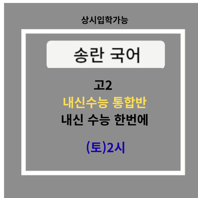 내신과 수능 둘 다 탄탄히 다지는 내신수능 동반상승 내신수능 통합반 수능실전 훈련으로 수능 강화+맞춤 내신 수업으로 내신 강화 < 내신수능 동시대비반 > (토)PM2-5시, 상시 입학 가능반 ■수능 완성반 특징 1. 수능식 사고 학습, 오답 유형, 선지 유형, 출제자의 의도 파악 2. 매set 풀타임 모의고사 + 개인별 피드백 3. 내신 때는 내신으로 전환. 학교 프린트 교과서외 진도까지 꼼꼼히 4. 개인특성에 맞춘 과제를 제대로 풀게 규칙적 과제관리 5. 특전 - 개인별 80분 실전 전략 (만점전문 원장님의 컨설팅) 6. 본수업(주1회) + 과제관리(주1회) 서울대 의대 수석을 배출한, 송란 국어 <img src="https://blogthumb.pstatic.net/MjAyNjAzMDhfMTM4/MDAxNzcyOTY4ODYxOTg2.s6RcYMsepLWJ8CgOIjmPxqgOD0NyIBVFhOv77qS3-lkg.YhE7JWAnfK7hvQC_AgEZ7BqEJLEBuQEr12aSgc6um04g.PNG/%B0%ED2_%B3%BB%BD%C5%BC%F6%B4%C9%C5%EB%C7%D5%B9%DD_.png?type=s3" />
