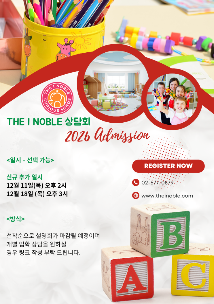 더아이노블 강남본원에서는 다가오는 입학 설명회를 통해 우리 원의 교육 철학과 프로그램에 대해 자세히 안내드리고자 합니다! 이번 설명회는 4세부터 7세까지의 유아를 대상으로 하며, 각 연령대에 맞춘 교육 방안을 소개해 드릴 예정입니다. <일시 - 선택 가능> 12월 11일(목) 오후 2시 12월 18일 (목) 오후 3시 <방식> - 선착순으로 설명회가 마감될 예정이며 개별 입학 상담을 원하실 경우 하기 링크 작성 부탁 드립니다. * 문의: 02-577-0579 * 홈페이지: www.theinoble.com 신청링크 https://forms.gle/EVLs91ZrQV2B3YcU9 더아이노블 강남본원 상담문의 02-577-0579 매봉역 4번출구 대치중학교 앞 We are a professional and ....... <img src="https://blogthumb.pstatic.net/MjAyNTEyMDVfMjkw/MDAxNzY0OTI0NjU0MzEy.mYgO3yeaJNg8p4CCET3vLxyBL9pJ1oZ6F0R5UkfRhWUg.hCgiLqlaN2PSt8OujxsWhUV7LS8Xmuz72F7eH7Pau9cg.PNG/Red_Modern_Kindergarten_Classroom_Flyer.png?type=s3" />