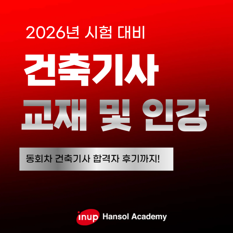 안녕하세요 한솔아카데미입니다. 2026년 건축기사 시험을 준비하고 계시는 수험생 여러분들 건축기사 자격증은 어떤 교재와 어떤 강의로 공부를해야할지 고민이 많으실거예요. 건축기사 필기 시험은 특히나 과목 수가 많고 계산이나 이론 문제를 중심으로 다양하게 출제되어 독학으로 혼자서 공부하기엔 쉽지 않은 난이도의 시험이기에 오늘은 2026년 건축기사 자격증 시험 대비 방법과 함께 실제 수험생들이 많이 사용하고 있는 한솔아카데미 교재와 인강, 활용법 그리고 동회차 합격자의 합격수기까지 자세히 한번 들어보도록 하겠습니다! 건축기사 교재 선택시 체크해야 할 사항! 먼저 건축기사 공부를 본격적으로 하기 전, 건축기사 교재를 선....... <img src="https://blogthumb.pstatic.net/MjAyNTEyMDlfODQg/MDAxNzY1MjY4MzI0NDk3.Dz_EwaCW8yeP6Vn1A5JEqBbWl7RGuJ4Qn4VH_LkuE4wg.QbyVaVFxUT4SvlWwRx4plL1JBvbL8jrd08qUjSrn4Usg.PNG/2.png?type=s3" />