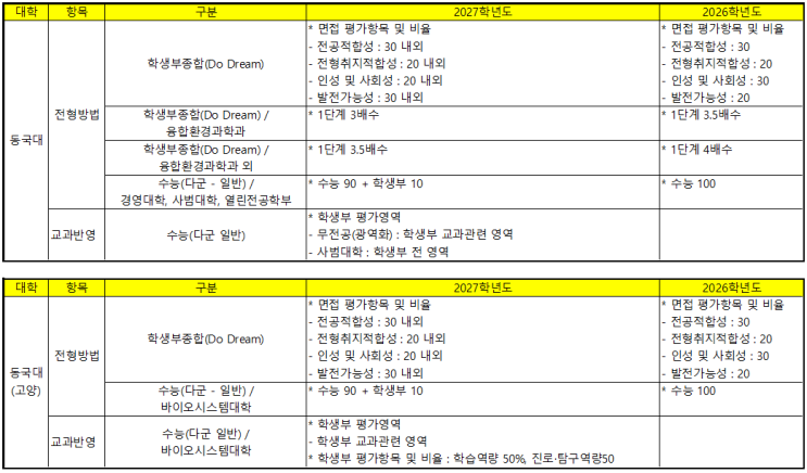 시행계획기준 - 최종은 4월 발표되는 확정 계획을 꼭 체크하시기 바랍니다. * 동국대의 경우 가장 큰 변화는 정시(수능)모집 단위에서 2026학년도까지는 수능 100%로 선발하던 것을 2027학년도부터는 수능 90% + 학생부 10%(정성평가 포함)로 반영하는 것으로 변경이 되었다는 것입니다. 동국대 학생부종합(Do Dream)전형에서 면접 평가 항목 및 비율이 변경되었습니다. 정시(수능) 다군의 경우는 학생부 교과관련 영역 평가가 추가 되었습니다. 다군에서 모집하는 학과 무전공(광역화) 학과 : 경영대학(단과대학모집), 바이오시스템대학(단과대학모집), 열린전공학부(인문), 열린전공학부(자연) 으로 총 248명 모집 사범대학 : 교육학과, 국어교....... <img src="https://blogthumb.pstatic.net/MjAyNjAyMjRfNjEg/MDAxNzcxOTE1MTQ3Njk0.IS9EsOfMNaaX5xnIpMxmdur_2ulEr5lnKgB9KG8EIgUg.UpAnusohvETorTsrKKaZ8IQSypkoQmfZwentHtqQwXog.PNG/image.png?type=s3" />