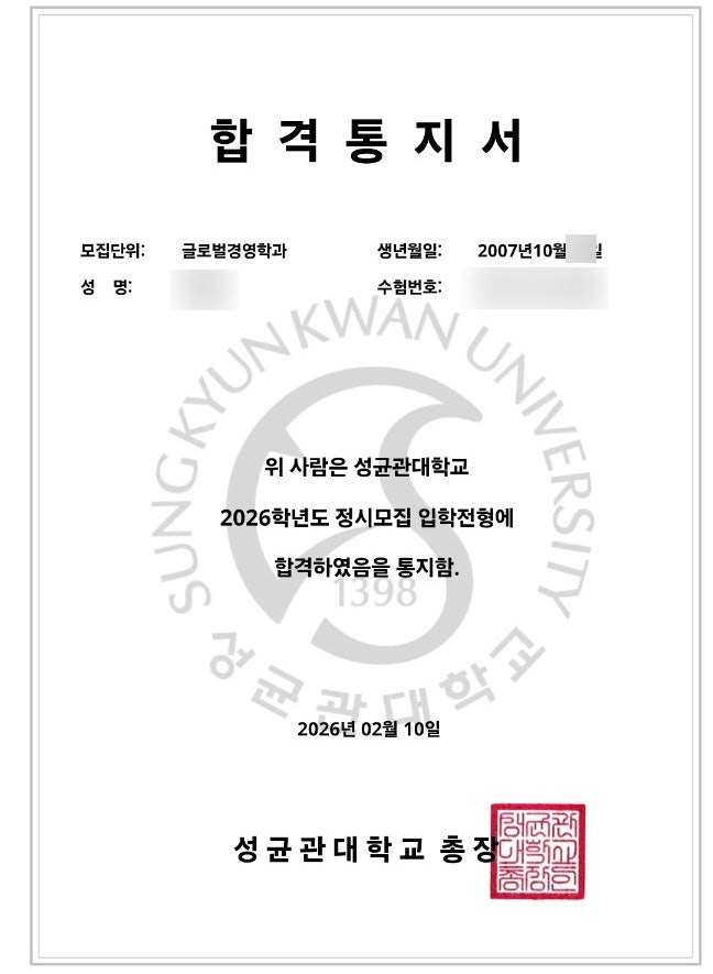 수시시즌이 끝나고 정시 합격발표가 대부분 되어서 대학 신입생으로써 기쁜마음으로 입학을 기다리는 학생들로 추운 겨울이 끝나고 따뜻한 봄이 찾아오는 시기입니다. 저는 개별맞춤 수업을 진행하면서 고3학생들을 많이 데리고 진행하진 않지만 평균적으로 매년 4~5명의 고3 학생을 개별지도하며 수시, 정시 수업을 진행중이며 정시를 진행한 학생들이 한명한명 합격 결과를 보내주고 있습니다~! 아쉽게 재수를 하는 학생도있지만 이런 학생들 또한 한번 더 도전하겠다는 멋진 행동이라고 생각합니다. 매년 여러 대학의 합격소식을 전해야지하면서 수업준비 등으로 놓쳤던 부분들이 많은데 방학특강이 끝나는 시기에 맞춰서 정리해 봅니다. 좀 더....... <img src="https://blogthumb.pstatic.net/MjAyNjAyMjNfMTE0/MDAxNzcxODEzODU1NDM4.BQUAMJ5nXC9ZyHfN47hG5_Uk1e7WyHkUHGd645vbXz4g.dT84gNef-gDpFAFMsZ9a8SM2cnOw3iSVwtWT3VuGT2wg.JPEG/KakaoTalk_20260212_192715190_01.jpg?type=s3" />