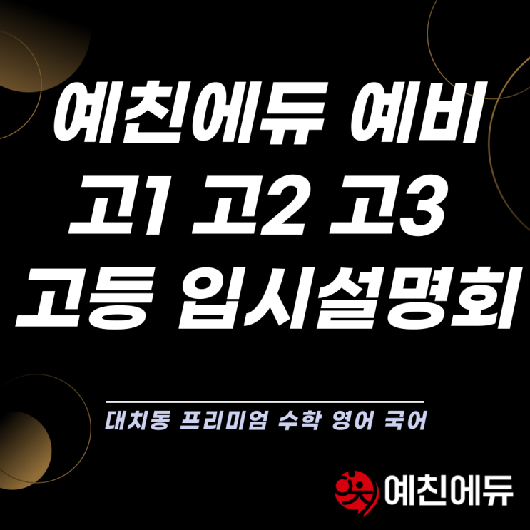 " 대치동 예친에듀 예비고1 고2 고3 고등 입시설명회 " 안녕하세요, 대치동 수학 영어 국어 예친에듀입니다. 2027학년도 수능, 그리고 앞으로 다가올 입시 변화까지 정확하게 대비하고 싶은 예비고1·고2·고3 학생 및 학부모님을 위한 “대치동 예친에듀 고등 전략 입시설명회”를 안내드립니다. 이번 고등 전략 입시설명회는 2027학년도 수능에 대한 전망과 수시 정시에 대한 내용이 포인트이지만, 예비고1 예비고2 학생들에게도 도움이 되도록 학년별 맞춤 내신·수능 전략까지 입시 성공에 필요한 모든 핵심이 ‘단 한 번에’ 정리되는 자리입니다. " 대치동 예친에듀 예비고1 고2 고3 고등 입시설명회 " 대치동 예친에듀 고....... <img src="https://blogthumb.pstatic.net/MjAyNTEyMDZfMzEg/MDAxNzY1MDEwNzg5NjYz.rC28G7cFe28qZClQc3qNTFS56xE7w83uOr7TQ6AjAAog.DoqnHko4NCP0GGcPCMmjw0xsW6RqTRNerndHAk0W7L0g.PNG/%BA%ED%B7%CE%B1%D7-001_%2878%29.png?type=s3" />
