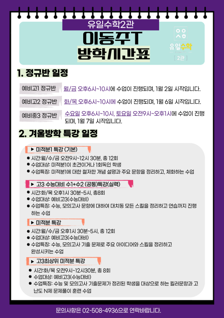 [대치동 유일수학] ■2관 이동주T 겨울방학 시간표 안내■