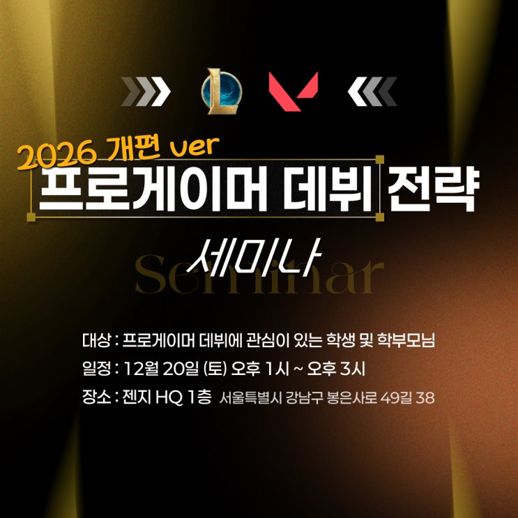 안녕하세요 젠지글로벌아카데미입니다! :) 여러분 발로란트와 리그 오브 레전드의 커리큘럼이 개편되었다는 소식 들으셨나요? GGA 프로게이머 준비반이 GGA PRO라는 이름으로 개편되었는데요, 발로란트 주요 개편안 살짝 살펴볼까요? GGA PRO 주요 개편 POINT ✅티어 기반 분반 및 승격 시스템 ✅수준에 따른 주요 학습 목표 ✅업그레이드 된 수강생 혜택 및 이벤트 ✅정규 수업 외 게임 습관 관리 교육 위 내용 외에도 다양한 부분에서 이전과 달라진 부분이 있는데요! 자세한 개편 내용은 이번 12월 20일에 있을 프로게이머 데뷔 전략 세미나에서 확인해 보세요! 이번 세미나는 발로란트와 리그 오브 레전드(롤) 두 개의 종목이 함께 진행....... <img src="https://blogthumb.pstatic.net/MjAyNTEyMTBfMjg5/MDAxNzY1MzQ5NjQ2MDEx.AuMRKeDoQkUHXNctjY4M1i7ezqMkK-W-vGASDHlw-fMg.nVgz1P0ho4Okq4XqnIZd1hS7o2_Vrzu99QfS7y7Yn38g.JPEG/2026_%C7%C1%B7%CE_%B5%A5%BA%DF_%C0%FC%B7%AB_%BC%BC%B9%CC%B3%AA_%BA%ED%B7%CE%B1%D7_%BC%B6%B3%D7%C0%CF.jpg?type=s3" />