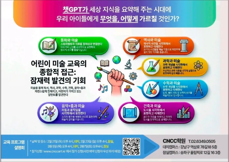 Ai가 모든것을 요약해주는 이 시대에 아이들이 진정으로 배워야 할것은 무엇일까요? 급변하는 시대속에 흘러가는 한 아이가 아니라 주도적으로 AI를 이용하여 더 스마트한 방법으로 이끄는 능력을 갖추도록 길러내는것이 우리의 방향입니다. 그 모든 키가 '미술'에 있는것이 핵심 입니다. 수업설명회 신청 아래링크에서 클릭하여 진행해주세요 www.cnccart.kr <img src="https://blogthumb.pstatic.net/MjAyNjAyMThfMjE1/MDAxNzcxNDI0NTUzNDE3.Gprhm78gxCL612GSe0VIaDln-I2-dwRweD2C8J6MlLEg.iabMUut05m6RtxF1D3PgjJ_dcVXk1fqbs0uush7bNPUg.JPEG/900%A3%DFScreenshot%A3%DF20260212%A3%DF162117%A3%DFHancom_Office_Viewer.jpg?type=s3" />