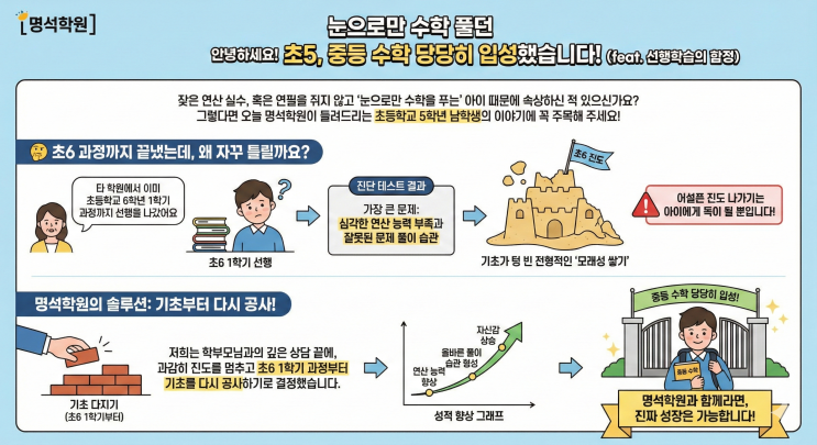 안녕하세요! 명석학원입니다. ^^ 오늘은 타 학원에서 진도 빼기식 선행 학습을 하다가, 성적이 오르지 않아 답답해하시던 학부모님들께 희망이 될 만한 진짜 성장 스토리를 들려드리려고 합니다. 잦은 연산 실수, 혹은 연필을 쥐지 않고 '눈으로만 수학을 푸는' 아이 때문에 속상하신 적 있으신가요? 그렇다면 오늘 명석학원이 들려드리는 초등학교 5학년 남학생의 이야기에 꼭 주목해 주세요! "초6 과정까지 끝냈는데, 왜 자꾸 틀릴까요?" 이 친구는 명석학원에서 수학 성적이 쑥쑥 오른 중학교 2학년 형을 보고 찾아온 동생이었습니다. 상담 시 어머님께서는 "타 학원에서 이미 초등학교 6학년 1학기 과정까지 선....... <img src="https://blogthumb.pstatic.net/MjAyNjAyMjZfMjY1/MDAxNzcyMDkyMDE0MTk2.59AudIS4igElHXO_wld1o24ifans9NQwzTl2r_0Zr7cg._VdeznGpnYvPNd1msSfffnTx1V3z76JgqPcK1iPBkt8g.PNG/1.png?type=s3" />