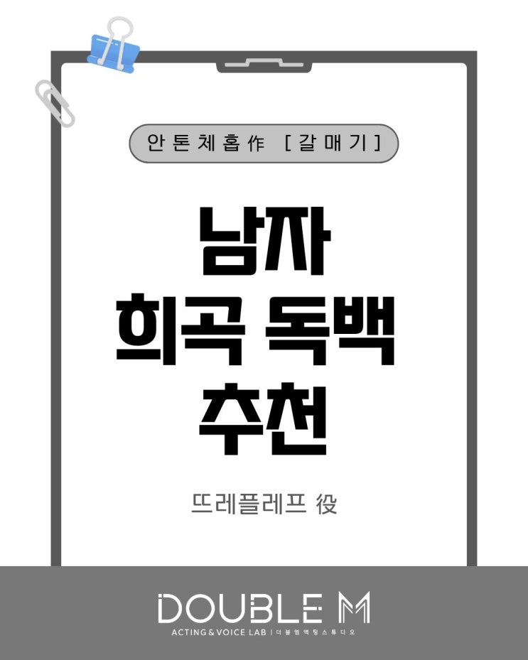 안녕하세요, 더블엠 연기학원입니다 :) 독백은 입시에서 연기력의 핵심을 판단하는 중요한 기준 중 하나입니다. 여러분의 강점을 드러낼 수 있는 다양한 독백을 찾으신다면 집중해주세요 ! 이번에 소개해드릴 독백은 안톤체홉 작가의 [갈매기] 뜨레플레프 역 입니다. 희곡도 파일로 함께 첨부해드리니 읽어보시기 바랍니다 -! 카카오톡 오픈 채팅 링크 고결한 사람이라구요! 어머니와 저는 그 사람 때문에 이렇게 매번 다투고 있는데, 지금 그 사람은 니나를 부추기고 그녀에게 자기가 천재라는 것을 확신시키려고 애쓰고 있을걸요. 하지만 저는 존경하지 않아요. 어머니는 저도 그 사람을 천재로 여겨주기를 바라지만, 죄송하지만, 저는 거짓말....... <img src="https://blogthumb.pstatic.net/MjAyNjAzMDNfMjMg/MDAxNzcyNTE2Mjc3MzI3.Sd6OcinFNICUlVewluCwyBKu4BRtwBeLLEPiFhMqFxAg.lxkylGEAmGQq_XdK-dId8_q_Npk9eXYaN0eZrrGh_xcg.JPEG/15.jpg?type=s3" />