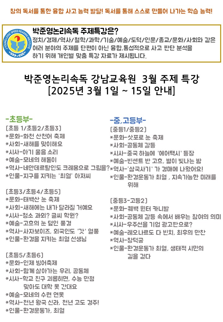 안녕하세요. 박준영논리속독 강남(일원)교육원입니다. 3월의 주제 특강을 통해 우리 학생들이 비문학/문학적 소양을 키우며 자기주도학습을 통해 스스로의 공부방법을 만들어내는 수업이 진행됩니다. 운동을 하여 체력을 키우는 것처럼 주제 특강 프로그램으로 공부에 자신감 넘치는 공부 체력을 키워나갑니다. 박준영논리속독은 정치/경제/역사/철학/과학/기술/예술/도덕/인문/종교/문화/사회와 같은 여러 분야의 주제를 단편이 아닌 융합,통섭적으로 사고 판단 분석을 하기 위해 학습별 맞춤 특강 자료가 제시됩니다. NIE, 논리정독, 논리사고와 같은 주제 논술을 통해 선생님과 함께 즐겁게 학습하고 있습니다. [ 시사 속으로-우주선을 기업 광....... <img src="https://blogthumb.pstatic.net/MjAyNjAyMjdfNzAg/MDAxNzcyMTk3MDc0NzM5.HkuXG1aHgJRqFA8O9xce2HPqkDsGVV-iC1vLVS0Hk_gg.ycQ3r0wwzTD5tKM8xIUrBItU4Zw9kF1kJ5Znn-PzwCsg.JPEG/2%BF%F9_28%C0%CF.jpg?type=s3" />