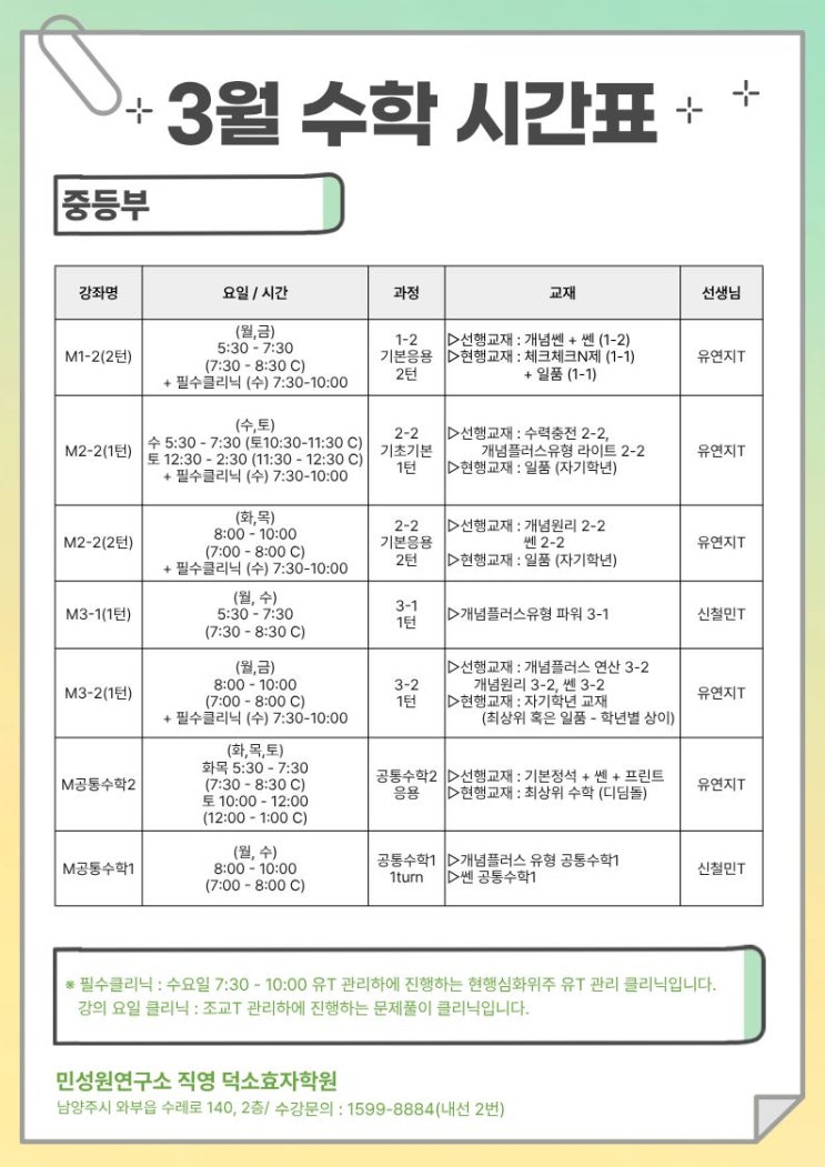 안녕하세요, 덕소효자학원 3월 시간표입니다. 촘촘하게 짜여진 중등부 / 고등부 시간표 확인하세요 :) 문의사항은 1599-8884(내선2) 덕소 직영점으로 전화 주시기 바랍니다. 혹은 아래 상담 신청서에 기입해주시면 상담 전화 드리도록 하겠습니다. <img src="https://blogthumb.pstatic.net/MjAyNjAzMDNfNCAg/MDAxNzcyNTM2MTU1MTE5.1KRD4iYh9lgQ5YQF0I9Do_IVEcBZtiB58flFRySpPd0g.WLa3RiQ0gU5rLvYGjcv2DZu1aBrSHNZmT6CEnKP_uGkg.JPEG/3.jpg?type=s3" />
