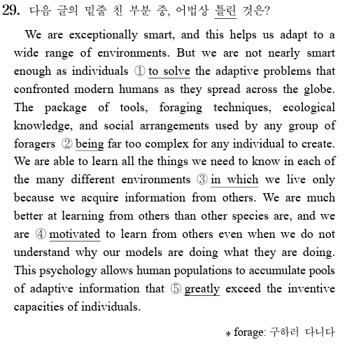 수능 어법 유형 29번은 다음과 같은 범주 내에서 출제된다. ● 수,태.시제: 단수vs복수, 수동 vs 능동 ● 동사 vs 준동사 ● 관계사 구별: 관계대명사 vs 관계사 ● 형용사 vs 부사 29번 문항은 디테일한 독해를 요구하지는 않지만 전체적인 맥락을 이해해야 하고 구조 파악 즉 "뼈대바르기"를 통해 구조를 분석할 수 있어야한다. 뼈대바르기를 통해 문장 구조를 분석해보자! ① to solve : smart를 수식하는 “부사적 용법”으로 OK. 형용사 + enough + to 부정사 : “~ 할 만큼 충분히 ~ 한” (의미상 역할: 결과/정도~할 정도로) [해석: 하지만 우리는 개인으로서는 전 세계로 퍼져 나가던 현대 인류가 직면했던 적....... <img src="https://blogthumb.pstatic.net/MjAyNjAzMDJfMjkx/MDAxNzcyNDM5ODQyMDM5.YlTGd8n9ZdzWwyynu0NWjgSbzrBRlI9xrEYFXHsaOe0g.d7tAMsPp_0RILHBbmiFJGjOUzy4zMJJmh7Y9LZ8LYOYg.PNG/29.png?type=s3" />