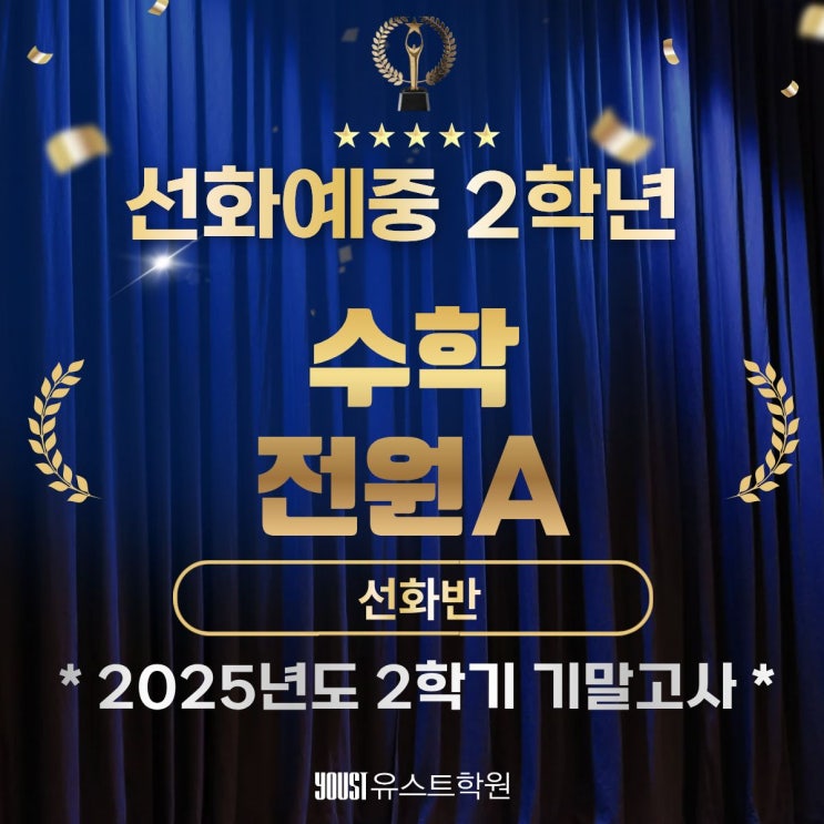 안녕하세요. 예중예고 내신전문, 학과전문 유스트학원입니다. 오늘은 지난 중간고사에 이어 2학기 기말고사에서 연달아 선화반 전원 A를 획득한 놀라운 성과를 축하하는 소식을 전합니다. 수학 고득점, 이렇게 만들어집니다 수학 점수는 단기간에 만들어지지 않습니다. 그래서 유스트학원 수학은 단순한 문제 풀이를 넘어, 내신 만점은 기본, 강남권 수준의 시험 대비까지 함께 고려한 수업을 진행합니다. 중학교 내신에서 끝나는 수학이 아니라, 고등학교 심화 과정까지 자연스럽게 이어질 수 있도록 지금 단계에서 무엇을 준비해야 하는지 세심하게 설계합니다. 예중학생에게 맞는 수학 학습 전략 예중학생들의 특성상 초등 5~6학년 시기에 수....... <img src="https://blogthumb.pstatic.net/MjAyNjAyMDhfMjEx/MDAxNzcwNTM1Mzk5MDE3.CUPGNU21Y5it9V0zdm4yAlyGO9BpCqC3z7XIEje7wqsg.kdkxZ93vCYOizVTl7XktGFks19z3WDV7IOyDoBcf5zwg.JPEG/1.jpg?type=s3" />
