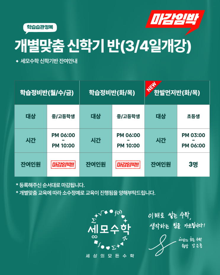 대치동 수학학원 세모수학|중·고등 일부 반 마감 임박, 초등 신설반 모집 중