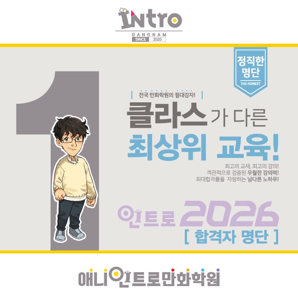입시만화학원 강남인트로의 2026학년도 합격자 명단 안녕하세요! 인트로만화학원 강남캠퍼스입니다!~ 어느덧 2026학년도 대학입시가 끝나고 합격자 발표까지 끝나가고 있습니다.(아직 예비 충원합격자 발표중) 강남인트로에서 수업을 한 2026년 2월 10일기준 합격자 명단을 공개합니다. 이번 입시는 다른 해보다 학원내에서는 선택과 집중을 많이 한 해 였습니다. 실기수업을 받아서 대학을 진한학 학생들도 있지만 포트폴리오 전형으로만 입시를 준비했던 학생들도 있었으며, 실기수업과 포트폴리오수업을 병행하며 대학입시를 준비했던 학생들... 그리고 디자인 수업을 진행했던 학생 등 다양한 입시과목을 준비하느라 학생들과 학부모님! 그리....... <img src="https://blogthumb.pstatic.net/MjAyNjAyMTBfNjYg/MDAxNzcwNjkzMDI5ODIx.vZtvM2uvJmxQbDoiNtg4ILz8FKe4pgpDUSmnXBOzH4kg.x0wkroxtWIxgjdvwdzMG00i1q9NsZ4YqMfXx0zJ6WGcg.JPEG/00_%BD%E6%B3%D7%C0%CF.jpg?type=s3" />