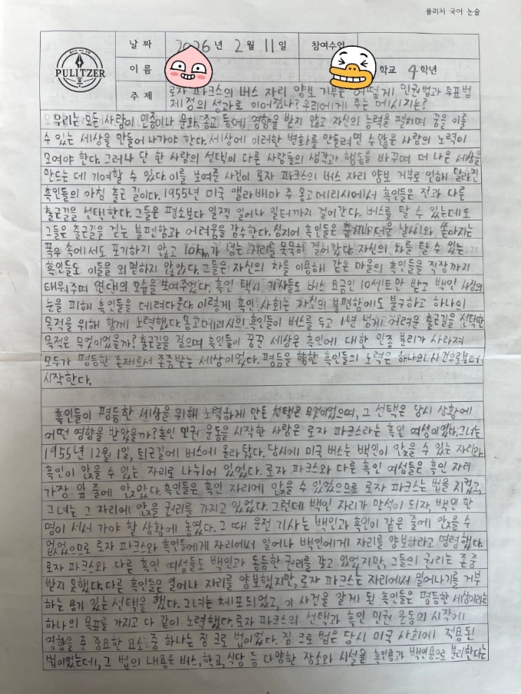 1950년대 미국사회에 변화를 가져온 흑인민권운동에 대해 알아보았습니다. 그 시작이 된 로자파크스의 버스자리 양보거부와 당시 미국사회를 지배하고 있던 '짐크로법', 이에 저항하는 흑인들의 버스 보이콧과 '비폭력 불복종' 운동으로 잘 알려진 마틴 루터 킹목사의 워싱턴 대행진까지 알아보면서 흑백 차별을 극복하기 위해 모두가 함께 했던 저항의 역사를 퓰리처 교재를 통해 공부했습니다. 퓰리처에서는 교재를 통해 배운 역사적 사건과 사실을 글로 쓰게 하면서 학생들의 독해력에 문제가 없는지 확인하고, 오류가 있는 부분은 바로 잡아주면서 정확하게 읽는 법을 지도하고 있는데요, 많은 학생들이 초등부터 글에서....... <img src="https://blogthumb.pstatic.net/MjAyNjAyMTFfNSAg/MDAxNzcwNzk4Mzk0Njkw.h1j1-HKXo_eMw_n0wCkZUsfY6be7PEmbLr3IGNlw3Wog.do2q2TBUycJ2yUFJE4a1xXDN1ykc5lZMbcyRdDDUOKYg.JPEG/900%A3%DF1770794832280.jpg?type=s3" />
