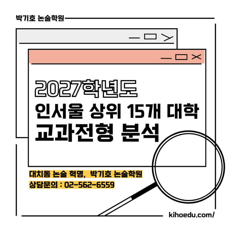 안녕하세요. 박기호 논술입니다. 대학 입시의 한 축인 '2027학년도 학생부교과전형'의 주요 변화를 정리해 드립니다. 서울대를 제외한 상위 14개 대학의 교과전형 모집 인원은 약 5,700명으로 전체의 약 11.5% 수준입니다. 모집 규모는 작년보다 소폭 줄었지만 숙명여대의 서류 도입 등 주목해야 할 변화가 많습니다. 1. 2027 교과전형 핵심 키워드: "정성평가의 습격" 과거 교과전형이 '내신 100%'의 정량 평가였다면, 이제는 학생부의 내용을 들여다보는 정성평가 도입이 대세가 되었습니다. 숙명여대: 기존 교과 100%에서 교과 70% + 서류 30% 로 변경 서울시립대: 정성평가 비중을 기존 10%에서 20%로 확대했....... <img src="https://blogthumb.pstatic.net/MjAyNjAzMDJfMjcw/MDAxNzcyNDUxNTY1ODUy.1TtKbz7XeAwy0kGqQxC5011hnOe1CgpLBD4RfQzSOJQg.YJ7fVKn-h5Z_fzoBJDG4QFRwxl7Kj_mSXJCI6st8KHEg.PNG/3.png?type=s3" />