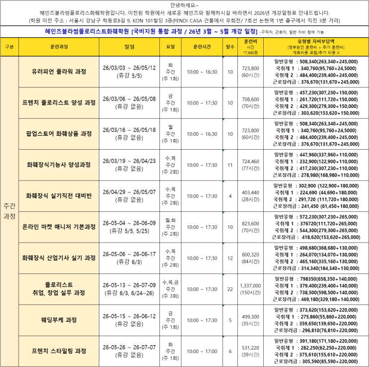 안녕하세요! 혜인즈블라썸 플로리스트화훼학원입니다. ^^ 2026년 3월~5월 국비과정/ 일반과정 수업을 안내해 드릴게요~ ↑ 파일로도 다운로드 받으실 수 있으니 확인 부탁드립니다. 학원에서 수강하실 수 있는 수업은 크게 1) 국비 지원수업 2) 일반과정 수업 으로 나뉩니다. 1) 국비 지원수업은 주간 / 야간 / 주말 반으로 구분이 되고요 ^^ 2) 일반과정 수업은 한 달에 한 번 수업으로 원데이클래스 진행하고 있습니다. 예쁜 봄 꽃들이 나오는 따뜻한 계절, 혜인즈블라썸에서 함께 꽃놀이 해요~! 문의사항 있으시면 언제든 연락 주시기 바랍니다. ^^ 감사합니다. T. 02-540-5436 HP. 010-9008-5436 카카오톡 문의 : hyeinsblossom <img src="https://blogthumb.pstatic.net/MjAyNjAyMjRfMTYg/MDAxNzcxODk4MTczNjE2.Dd_IDtjsrcZWPFgr6Yb2bk8mUWtJz4w06a9PbJB_4W0g.pOfIVR4qnp3krZXuWtQkSItByIsz2Qv9GH_NV3iljYUg.PNG/2026%B3%E2_3%BF%F95%BF%F9_%B0%B3%B0%AD%BE%C8%B3%BB_%28%C1%D6%B0%A3%B0%FA%C1%A4%29.png?type=s3" />