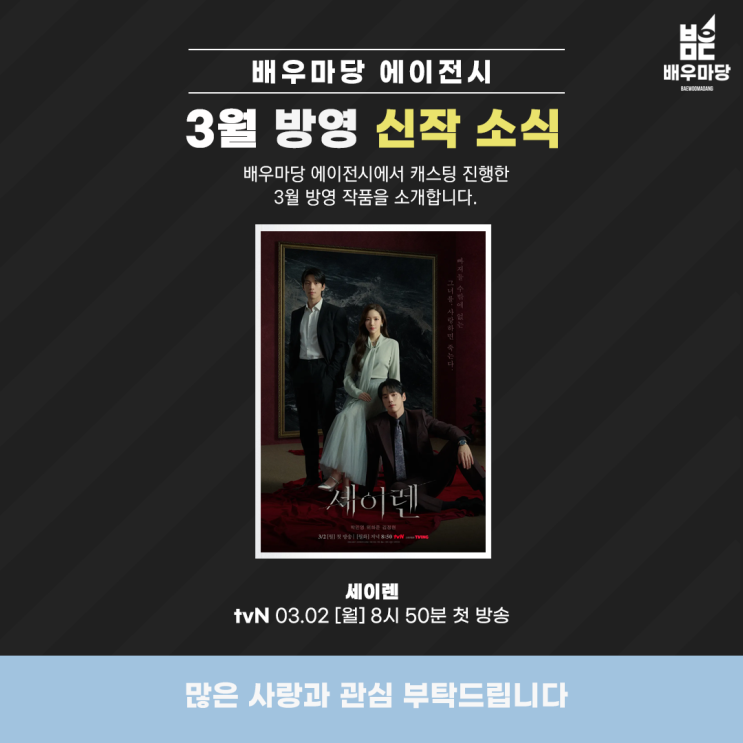 3월 2일 (월) 첫 방송 배우마당 캐스팅 디렉터 : 임나윤, 이정은 배우마당 에이전시는 tvN <세이렌>의 아역 전담 캐스팅을 맡았습니다. 빠져들 수밖에 없는 그녀를, 사랑하면 죽는다? 보험 사기를 조사하는 한 남자가 용의자로 의심되는 한 여자를 지독하게 파헤치며 시작되는 치명적 로맨스릴러 많은 시청바랍니다 배우마당 연기학원 X 배우마당 에이전시 -방송 실전을 배우고 캐스팅 디렉터가 함께 있는 곳 <img src="https://blogthumb.pstatic.net/MjAyNjAzMDNfMjY5/MDAxNzcyNTE3ODUxNzM5.C3GL_yjV0F-xkQI_pyD8cviR7yHmj1J8ip8sK-r5Q0Ig.VrcH8chK2DuWQocml_n6vfhs5mlv7rPq6GP2vCSDBGkg.PNG/KakaoTalk_20260303_131450325_01.png?type=s3" />