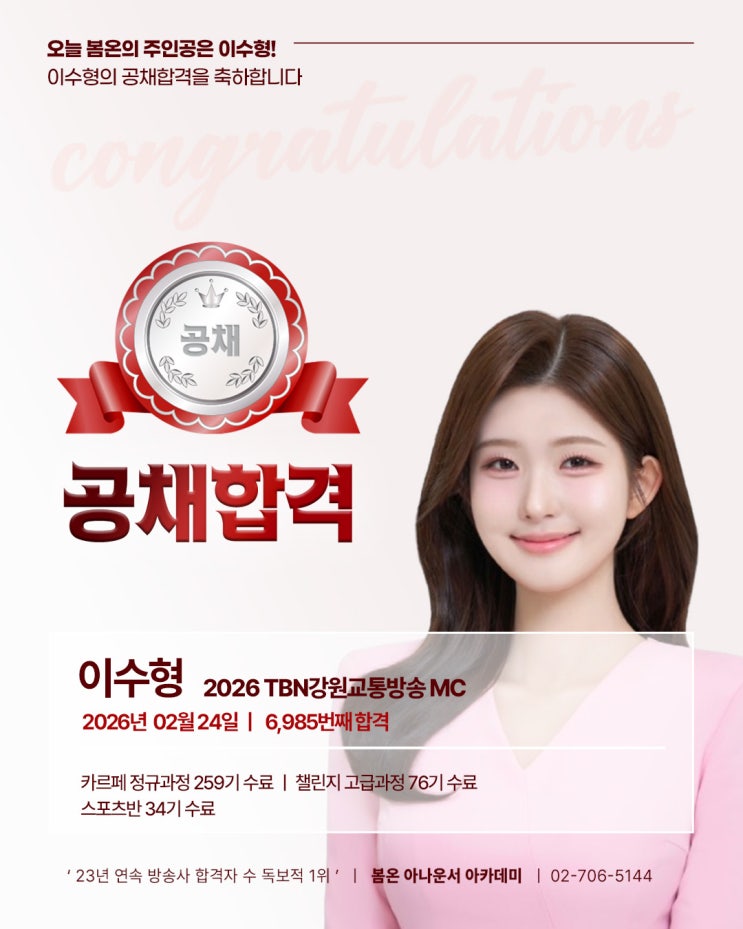 #봄온인의합격을축하합니다 #공채합격 봄온인의 방송진출을 진심으로 축하합니다. 2026 TBN강원교통방송 MC / 이수형 공채합격 카르페 정규과정 259기 수료 챌린지 고급과정 76기 수료 스포츠반 34기 수료 이수형 학생이 공채합격을 했단 소식을 전해왔습니다. 그 동안의 열정과 노고에 감사드리며 모두의 마음을 담아 이수형 학생의 합격을 진심으로 축하합니다! 앞으로 멋진 방송 활동 기대하겠습니다. 카카오톡 : @봄온아카데미 02)706-5144 #아나운서 #아나운서아카데미 #아나운서학원 #아나운서학원추천 #아나운서합격 #아나운서지망생 #아나운서합격생 #아나운서합격전문 #아나운서합격자 #봄온아나운서아카데미 #봄온아카데미 #봄온아카데....... <img src="https://blogthumb.pstatic.net/MjAyNjAzMDVfMTgy/MDAxNzcyNjY3NDM3NTA0.n8gZph0Nz0kbKQ7YlRMeMuqvYeIl81hv-ye3EwzKp7Ig.Up2F0z2eucvs5W-RqC7mJ3RNI8yAISHqP1ItrhegdEkg.JPEG/250124_%BA%BD%BF%C2%C7%D5%B0%DD-%B0%F8%C3%A4.jpg?type=s3" />