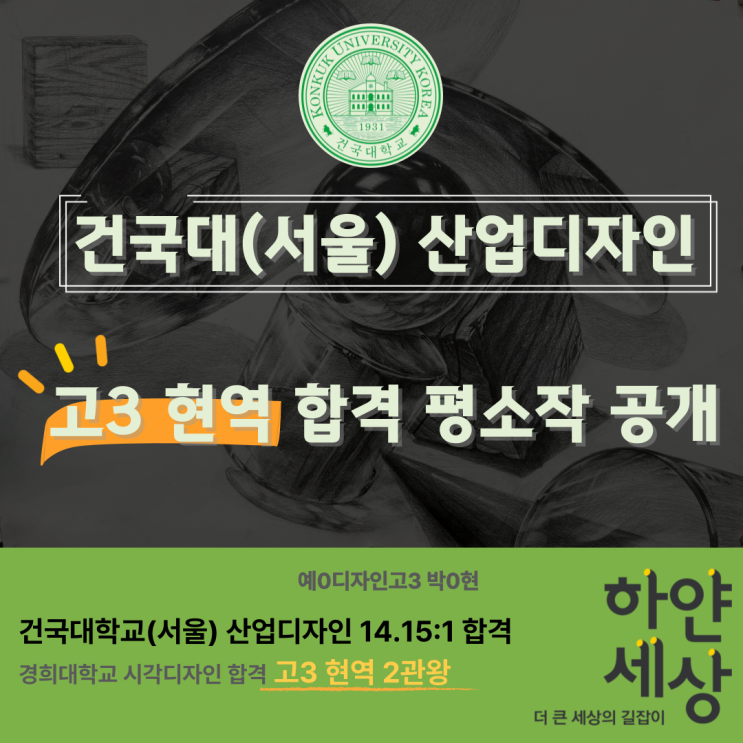 2026학년도 고3 현역 합격생 평소작 공개 건국대(서울) 산업디자인과 & 경희대 시각디자인 2관왕! 축하합니다~~!!! 안녕하세요 :) 오늘은 정말 기분 좋은 소식을 전해드리려고 합니다. 이번 2026학년도 입시에서 우리 학원 고3 현역 합격생이 ✨ 건국대학교(서울캠퍼스) 산업디자인과 ✨ 경희대학교 시각디자인과 두 곳 모두 합격하며 2관왕을 달성했습니다! 합격의 결정적 포인트 이 학생은 시험 전날, 원장님이 마지막으로 던져주신 주제로 직접 한 번 더 그려보는 연습을 했는데요. 놀랍게도… 실제 시험장에서 거의 동일한 주제가 출제되었다고 합니다. 덕분에 저희 학생은 당황하지 않고 이미 정리된 구도와 표....... <img src="https://blogthumb.pstatic.net/MjAyNjAyMjhfMjU0/MDAxNzcyMjYxNjc1NDE5.TBgUa3SmEqmRW9JUlj74ngIMdEEYj9i38QSZBvSAEM8g.3kDuuzMSyxucXSNcmXVXanTCRISPaIrOkPM_twNMfrcg.PNG/%C1%A6%B8%F1%C0%BB-%C0%D4%B7%C2%C7%D8%C1%D6%BC%BC%BF%E4_-002.png?type=s3" />